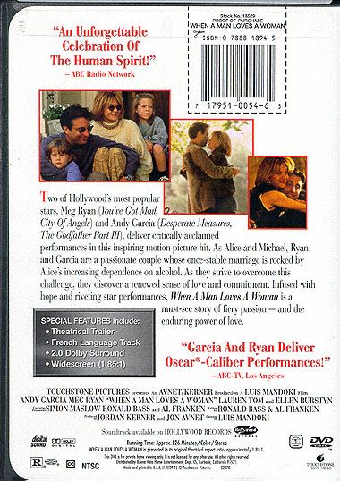 Two of Hollywood's hottest stars, Meg Ryan (You've Got Mail, City of Angels) and Andy Garcia (Desperate Measures, The Godfather Part III), deliver critically acclaimed performances in this inspiring motion picture hit. As Alice and Michael, Ryan and Garcia are passionate couple whose once-stable marriage is rocked by Alice's increasing dependence on alcohol. As they strive to overcome this challenge, they discover a renewed sense of love and commitment. Infused with hope and riveting star performances, When A Man Loves A Woman is a must-see story of fiery passion - and the enduring power of love.