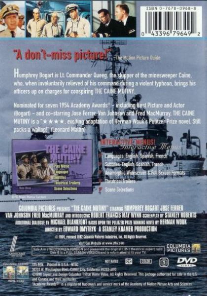 Humphrey Bogart is Lt. Commander Queeg, the skipper of the minesweeper Caine, who when involuntarily relieved of his command during a violent typhoon, brings his officers up on charges for conspiring The Caine Mutiny.