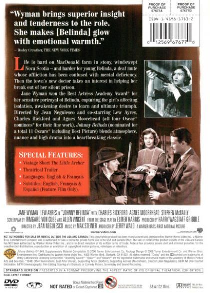 Jane Wyman won the Best Actress Academy Award® for her sensitive portrayal of Belinda, capturing the girl's affecting isolation, awakening desire to learn and ultimate triumph. Directed by Jean Negulesco and co-starring Lew Ayres, Charles Bickford and Agnes Moorehead (all four Oscar® nominees for their fine work), Johnny Belinda (nominated for a total 11 Oscars including Best Picture) blends atmosphere, nuance and high drama into a heartbreaking classic.