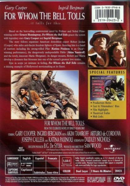 Based on a story by Ernest Hemingway. The story follows expatriate American demolition expert Robert Jordan who aides anti-fascist freedom fighters of Spain. Assisting him is a band of warriors including the strong-willed Pilar, the dangerously undependable Pablo and the lovely, innocent Maria. As danger mounts, Robert and Maria develop a closeness that blossoms into one of the screen's greatest love stories.