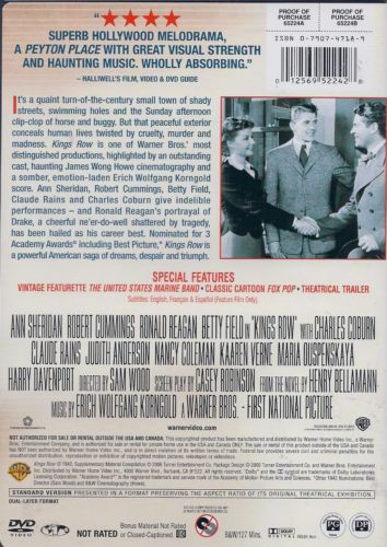 It's a quaint turn-of-the-century small town of shady streets, swimming holes and the Sunday afternoon clip-clop of horse and buggy. But that peaceful exterior conceals human lives twisted by cruelty, murder and madness. Kings Row is one of Warner Bros.' most distinguished productions, highlighted by an outstanding cast, haunting James Wong Howe cinematography and a somber, emotion-laden Erich Wolfgang Korngold score. Ann Sheridan, Robert Cummings, Betty Field, Claude Rains and Charles Coburn give indelible performances and Ronald Reagan's portrayal of Drake, a cheerful ne'er-do-well shattered by tragedy, has been hailed as his career best. Nominated for 3 Academy Awards? including Best Picture, Kings Row is a powerful American saga of dreams, despair and triumph.