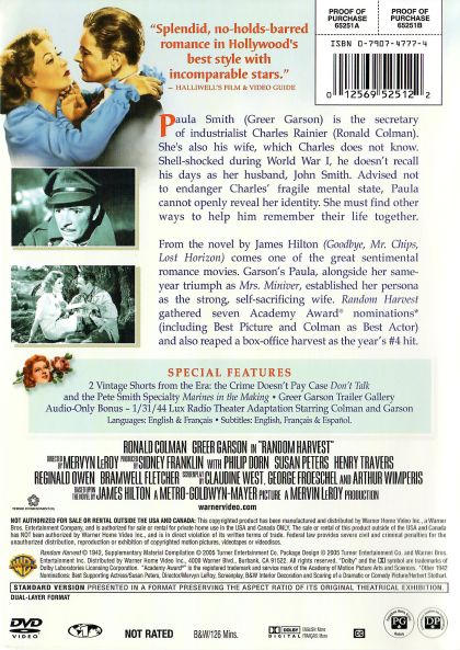 From the novel by James Hilton (Goodbye, Mr. Chips, Lost Horizon) comes one of the great sentimental romance movies. Garson's Paula, alongside her same-year triumph as Mrs. Miniver, established her persona as the strong, self-sacrificing wife. Random Harvest gathered seven Academy Award nominations (including Best Picture and Colman as Best Actor) and also reaped a box-office harvest as the year's #4 hit.