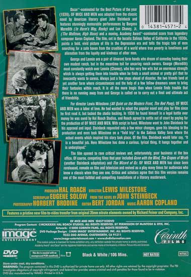 George and Lennie are a pair of itinerant farm hands who dream of someday having their won modest ranch, but in the meantime toil for uncaring ranch owners. George (Meredith) must constantly watch over Lennie (Chaney) who has very few wits but an enormous strength which is always getting them into trouble when he finds a small animal or pretty girl that he innocently wants to caress. Always just a few steps ahead of disaster, the two friends land at yet another farm where circumstances and the help of a few fellow dreamers seem to bring their fantasies within reach. It is all the more tragic then, when Lennie finds trouble that there is no running away from and George is called on to carry out a final and ultimate act of friendship.