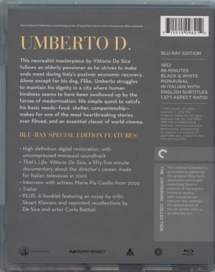 Shot on location with a cast of nonprofessional actors, Vittorio De Sica's neorealist masterpiece follows Umberto D., an elderly pensioner, as he struggles to make ends meet during Italy's postwar economic boom. Alone except for his dog, Flike, Umberto strives to maintain his dignity while trying to survive in a city where traditional human kindness seems to have lost out to the forces of modernization. Umberto's simple quest to fulfill the most fundamental human needs - food, shelter, companionship - is one of the most heartbreaking stories ever filmed and an essential classic of world cinema.