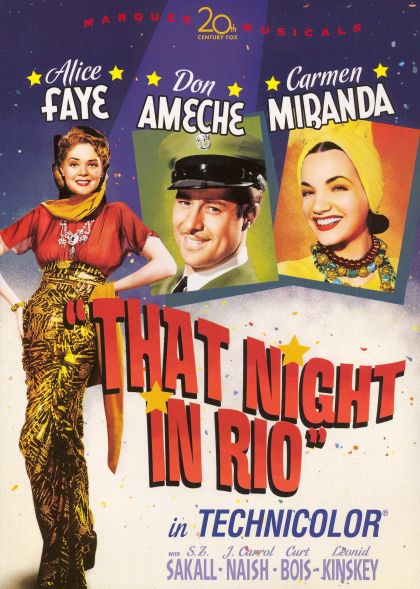 Don Ameche and Alice Faye pair up as husband and wife, Baron and Baroness Duarte and head to South America in this musical classic. In order to avoid some financial problems, the Baron switches places with impersonator Larry Martin "Direto da Broadway" (also Ameche). When Martin’s affections for the Baroness are too kind and romantic, both the Baroness and Martin’s girlfriend Carmen (Carmen Miranda) realize their men are up to something. Filmed in brilliant Technicolor®, That Night In Rio is a delightful comedy filled with rousing musical numbers including Faye’s passionate and romantic, "They Met in Rio."