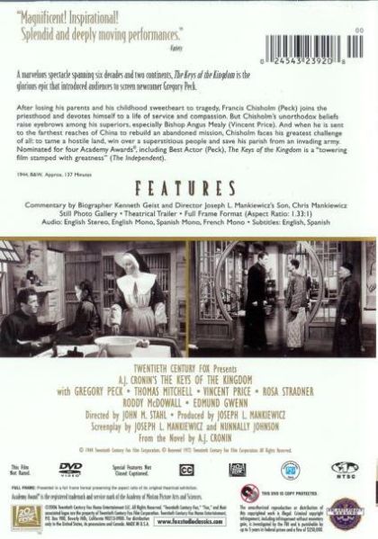 After losing his parents and his childhood sweetheart to tragedy, Francis Chisholm (Peck) joins the priesthood and devotes himself to a life of service and compassion. But Chisholm's unorthodox beliefs raise eyebrows among his superiors, especially Bishop Angus Mealy (Vincent Price). And when he is sent to the farthest reaches of China to rebuild an abandoned mission, Chisholm faces his greatest challenge of all: to tame a hostile land, win over a superstitious people and save his parish from an invading army. Nominated for four Academy Awards®, including Best Actor (Peck), The Keys of the Kingdom is a "towering film stamped with greatness" (The Independent).