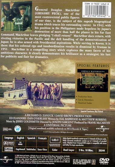 General Douglas MacArthur (Gregory Peck), one of the most controversial public figures of our time, is the subject of this superb biographical drama which traces his outstanding career. In 1942, with his position in the Philippines made hopeless by Japan's destruction of more than half the planes in his Far East Command, MacArthur leave pledging "I shall return!" MacArthur does return, with riveting victories in the Pacific and the deft handling of the democratization of Japan; he is also armed with Presidential aspirations. While serving in Korea, it is there that his colossal ego and insubordination results in dismissal by Truman in 1951. MacArthur is a compelling story which explores the many facets of his ambitious character. It clearly demonstrates his brilliance as a strategist; his lust for publicity and flair for dramatics.