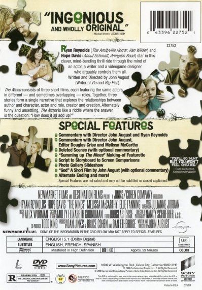 The Nines consists of three short films, each featuring the same actors in different - and sometimes overlapping - roles. Together, three stories form a single narrative that explores the relationships between author and character, actor and role, creator and creation. Alternately funny and unsettling, The Nines is like a riddle where the answer is the question: "How does it all add up?"