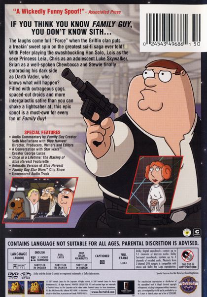 The laughs come full "Force" when the Griffin clan puts a freakin' sweet spin on the greatest sci-fi saga ever told! With Peter playing the swashbuckling Han Solo, Lois as the sexy Princess Leia, Chris as an adolescent Luke Skywalker, Brian as a well-spoken Chewbacca and Stewie finally embracing his dark side as Darth Vader, who knows what will happen? Filled with outrageous gags, spaced-out droids and more intergalactic satire than you can shake a lightsaber at, this epic spoof is a must-own for every fan of Family Guy!