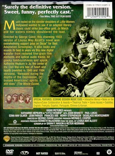 Directed by George Cukor, this charming 1933 version of Louisa May Alcott's novel won overwhelming support (plus an Oscar for Best Adaptation Screenplay). It also looks and sounds its best in years via this new digital transfer from restored fine-grain film elements and optical audio tracks. All gawky tomboyishness and spunk, Katherine Hepburn is Jo, the center of the Civil War-era tale of heart and hearth (revisited in 1949 and 1994 versions). "Released during the depths of the Depression, [it] buoyed Americans' spirits. It still does" (The Movie Guide).