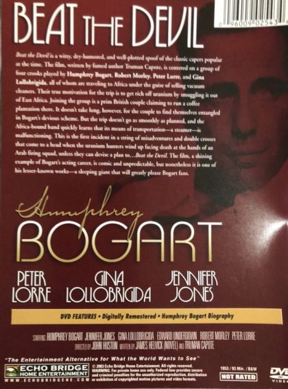 Beat the Devil is a witty, dry-humored, and well-plotted spoof of the classic capers popular at the time. The film, written by famed author Truman Capote, is centered on a group of four crooks played by Humphrey Bogart, Robert Morley, Peter Lorre and Gina Lollobrigida, all of which are traveling to Africa under the guise of selling vacuum cleaners. Their true motivation for the trip is to get rich off of uranium by smuggling it out of East Africa. Joining the group is a prim British couple claiming to run a coffee plantation there. It doesn't take long, however, for the couple to find themselves entangled in Bogart's devious scheme. But the trip doesn't go as smoothly as planned, and the African bound band quickly learns that their means of transportation - a steamer - is malfunctioning. This is the first incident in a string of misadventures and double crosses that come to a head when the uranium hunters wind up facing death at the hands of an Arab firing squad, unless they can devise a plan to...Beat the Devil. The film, shining example of Bogart's acting career, is comic and unpredictable, but nonetheless it is one of his lesser-known works - a sleeping giant that will greatly please Bogart fans.