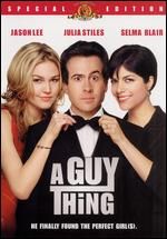 A man trying to save his relationship with the woman he loves finds himself sinking into a quicksand of small lies and half-truths in this comedy. Paul ( Jason Lee ) is a regular guy who is engaged to marry Karen ( Selma Blair ); while Paul loves Karen, he's more than a bit nervous around her family, even though her father ( James Brolin ) has already given him a job in the family business. Shortly before the wedding, Paul's friends throw him a bachelor party, complete with a boatload of liquor and a squadron of grass-skirt-clad tiki dancers. Paul strikes up a conversation with one of the dancers, the cheerful if inept Becky ( Julia Stiles ), and the next morning, he wakes up bleary-eyed with a massive hangover — and Becky in bed next to him. Paul soon receives a phone call from Karen saying she's stopping by for a visit, and Paul scrambles to get Becky out of his apartment. Paul attempts to explain some incriminating evidence with a few white lies, but a messy situation gets messier when Paul runs into Becky at a pre-wedding family get-together...and discovers she's Karen's cousin. A Guy Thing also features Shawn Hatosy , Lochlyn Munro , and Julie Hagerty . — Mark Deming