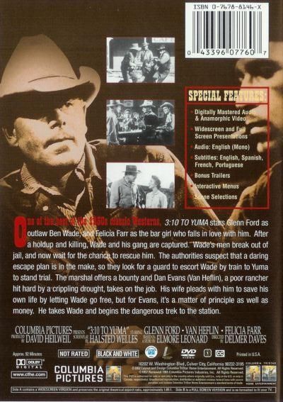One of the best of the 1950s classic Westerns, 3:10 To Yuma stars Glenn Ford as outlaw Ben Wade, and Felicia Farr as the bar girl who falls in love with him. After a holdup and killing, Wade and his gang are captured. Wade's men break out of jail, and now wait for the chance to rescue him. The authorities suspect that a daring escape plan is in the make, so they look for a guard to escort Wade by train to Yuma to stand trial. The marshal offers a bounty and Dan Evans (Van Heflin), a poor rancher hit hard by a crippling drought, takes on the job. His wife pleads with him to save his own life by letting Wade go free, but for Evans, it's a matter of principle as well as money. He takes Wade and begins the dangerous trek to the station.