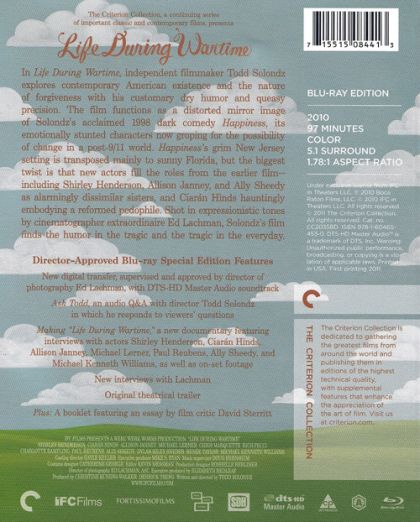 Whether it's viewed as a late-coming sequel to Happiness or a resurrection of its characters with different actors, Life During Wartime is classic Solondz storytelling. The cast play their roles with subtlety and measure from a screenplay wrought with both sadness and humour. For the uninitiated, Life During Wartime is funny and morbid in its realism. For long-time fans of the cult filmmaker, it speaks to the sense of play and the strength of one of the most original voices in American filmmaking.