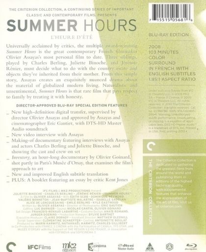 Three siblings must come to terms with their mother's mortality as they decide what to do with her valuable belongings in this warm family drama from filmmaker Olivier Assayas. Hélène Berthier (Edith Scob) is about to turn 75, and her children are gathering at her home in the country for a party. Adrienne (Juliette Binoche) has flown in from New York City, where she lives with her boyfriend, James (Kyle Eastwood). Jérémie (Jérémie Renier) has taken a rare break from his globe-trotting business interests to stop by with his wife (Valérie Bonneton). And Frédéric (Charles Berling), the only one who lives close enough to visit regularly, has also come with his spouse, Lisa (Dominique Reymond). Hélène has inherited a large and valuable collection of art from her brother, and with her health beginning to fail, she approaches Frédéric and asks that he, Jérémie, and Adrienne come up with a plan to deal with the pieces after her death. Frédéric wants to keep the collection together and see if they can persuade a gallery to purchase and present them as a set. Jérémie and Adrienne have other ideas, but as he's pondering a business opportunity in China and she's planning on settling in America for good, they don't have as much influence over the final decision as Frédéric. L'Heure d'Été (aka Summer Hours) was produced in part by the celebrated French art gallery Musée d'Orsay, and was one of a handful of films created to honor the museum in its 20th anniversary year.