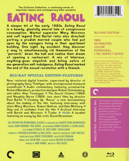 Eating Raoul is the rip-roaringly funny and outrageous cult classic from writer-director Paul Bartel (Scenes from the Class Struggle in Beverly Hills), starring comedy icons Bartel and Mary Woronov (Looney Tunes: Back in Action, Rock 'n' Roll High School) and Robert Beltran (TV's "Star Trek: Voyager").
