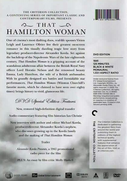 One of cinema's most dashing duos, real-life spouses Vivien Leigh and Laurence Olivier enact their greatest on-screen romance in this visually dazzling tragic love story from legendary producer-director Alexander Korda. Set against the backdrop of the Napoleonic Wars of the late eighteenth century, That Hamilton Woman is a gripping account of the scandalous adulterous affair between the British Royal Navy officer Lord Horatio Nelson and the renowned beauty Lady Emma Hamilton, the wife of a British ambassador. With its grandly designed sea battles and formidable star performances, Korda's film (Winston Churchill's favorite movie, which he claimed to have seen over eighty times) brings history to vivid, glamorous life.