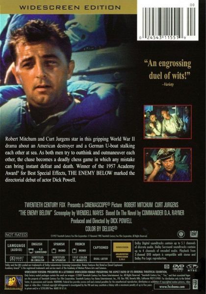 The Enemy Below is a study of submarine warfare from the vantage point of both sides. Robert Mitchum plays the captain of an American destroyer, who despite having lost his family in the war endeavors to let his head rule his heart in combat. Curt Jurgens co-stars as a German U-boat commander, depicted as being as honorable and compassionate as Mitchum. The two men develop a grudging mutual respect as they pursue one another throughout the North Atlantic. Based on a novel by D. A. Rayner, The Enemy Below was the last theatrical film directed by Dick Powell, who hereafter concentrated on his extensive television work. ~ Hal Erickson, All Movie Guide