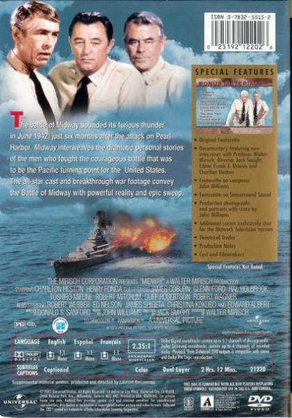 An expensive war epic, Midway emulates The Longest Day and Tora! Tora! Tora! in attempting to re-create a famous World War II battle from both the American and Japanese viewpoints. The 1942 battle of Midway was the turning point of the War in the Pacific; the Japanese invasion fleet was destroyed, and America's string of humiliating defeats was finally broken. Though the battle itself was sufficiently dramatic to fill two films, Midway also has plotline involving the mixed-race relationship between Ensign Garth (Edward Albert), son of Navy Captain Matt Garth (Charlton Heston), and Haruko Sakura (Christina Kokubo), a Hawaiian girl of Japanese descent. The real-life personages depicted herein include American Admirals Nimitz (Henry Fonda), Halsey (Robert Mitchum) and Spruance (Glenn Ford), and Japanese Admiral Yamamoto (Toshiro Mifune, his voice once again dubbed by Paul Frees, whom Mifune personally selected for the job). For its original road show release, Midway was offered in the "Sensurround" process, which electronically shook and vibrated the audience's chairs during the battle sequences. ~ Hal Erickson, All Movie Guide