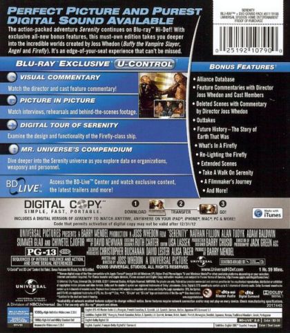 AMG Review: Joss Whedon's feature film adaptation of his much-loved television program Firefly marks his big-screen directorial debut. The film, however, not only draws in and enchants newcomers but remains familiar to fans of the series without indulging in the in-jokes that rendered the Star Trek: The Next Generation movie franchise too embarrassing for general consumption. Nathan Fillion, the only member of this ensemble cast that could arguably be described as a protagonist, delivers a likable and nuanced performance as Mal, the ragged captain of the freighter ship Serenity. Mal's resilience is tempered with a sarcastic cynicism as well as with a humanity that only selectively becomes more than a subtle internalization. The fight, flight, and general action sequences are beyond engaging, and the resolution of each would cause any audience to erupt in applause if viewers weren't paralyzed with anticipation. The plot itself is quite riveting, but more importantly, it brings each of the characters — all of whom are portrayed with elegance and obvious love — to a completely new place both personally and logistically. This is what makes Serenity so much more than an elongated episode of Firefly. In the event of a sequel, the landscape in which the story takes place will have been reformed, creating in many ways a new world for these much-changed people to explore. In the end, Joss Whedon triumphantly breaks new ground in the genre of science fiction, creating a universe that is neither utopian nor dystopian, characters who are both flawed and forgivable, and a sense of reality that, much like our own day-to-day perception, takes into account the sad fact that none of us are safe, but none of us will survive without hope that we will be. — Cammila Albertson