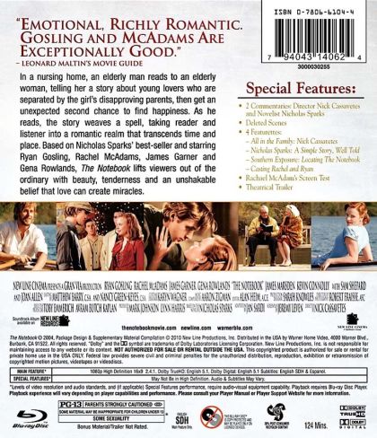 Directed by Nick Cassavetes, this adaptation of author Nicholas Sparks' bestselling novel revolves around Noah Calhoun's (James Garner) regular visits to a female patron (Gena Rowlands) of an area nursing home. Rather than bore her with the inanities of everyday life, Calhoun reads from an old, faded notebook containing the sweeping account of a young couple (Ryan Gosling and Rachel McAdams) whose love affair was tragically put to a halt after their separation in the midst of World War II. Seven years later, the couple was reunited, and, despite having taken radically different paths, they found themselves unable to resist the call of a second chance. The Notebook also features Joan Allen, Sam Shepard, and Kevin Connolly. — Tracie Cooper