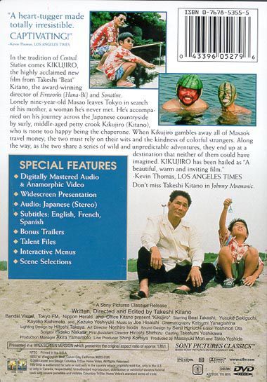 It's summer and nine-year-old Masao has no one to play with. With soccer practice suspended and his friends away at the beach, living alone with his grandmother seems even less fun. By chance, Masao discovers the address and photo of the mother he has never met. But with little money and even less sense of direction, he needs help. A friend of his grandmother volunteers her husband, Kikujiro, to accompany the boy on his quest. Kikujiro hardly seems an ideal companion for anyone, let alone for a boy as sensitive as the sullen Masao. Brash, loud-mouthed and always on the lookout for easy money, the irresponsible Kikujiro doesn't even appear to be overly fond of children. The first stop for the unlikely pair is to the cycle races, where Kikujiro gambles away the boy's travel money. In order to continue their journey, the two are forced to hitch rides, which they do with varying degrees of success. Ultimately, the two of them end up at a destination that neither of them could have imagined.