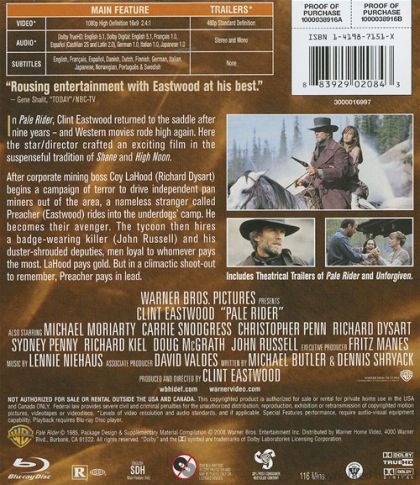 A mysterious and possibly otherworldly stranger comes to the rescue of a frontier town in this Western, which was strongly influenced by the George Stevens classic, Shane . The peace of a small mining community is shattered when Coy LaHood ( Richard Dysart ), the ruthless proprietor of a powerful strip-mining company, arrives in town with his son Josh ( Christopher Penn ) and a posse of hired guns to drive out the townspeople and take control of the territory. Megan ( Sydney Penny ), a young girl whose pet was killed in the melee, prays to God for someone to defend the village from the marauders; soon, the Preacher ( Clint Eastwood ) arrives on a pale horse, and joins forces with Hull Barrett ( Michael Moriarty ), the unofficial leader of the miners and one of the few who attempts to defend himself, to take a stand against LaHood and his men. As the Preacher and Barrett try to organize the miners to fight the invaders, both Megan and her mother Sarah ( Carrie Snodgrass ) find they're drawn to the Preacher, who keeps to himself and seems to have more than his share of secrets. Pale Rider was also directed by leading man Clint Eastwood ; it was his first Western as both director and star since the acclaimed The Outlaw Josey Wales . — Mark Deming