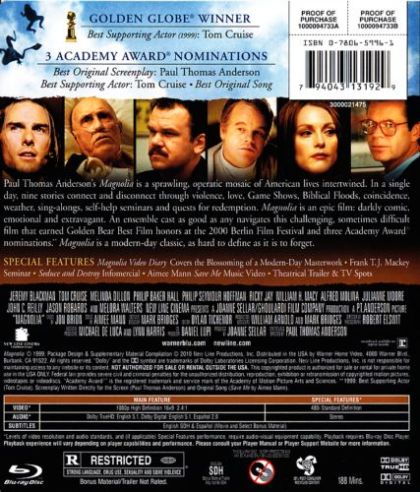 Writer/director Paul Thomas Anderson followed his critical and commercial breakthrough Boogie Nights with this wildly ambitious story of lives intertwining on a single day in California's San Fernando Valley. Earl Partridge ( Jason Robards ), a successful producer of television game shows, left his wife when she contracted cancer to marry the younger and more beautiful Linda ( Julianne Moore ). Now, Earl has cancer himself, and Linda spends her day fetching medicines and trying to deal with the imminent death of her husband, whom she has only now come to love. Earl asks his nurse Phil ( Philip Seymour Hoffman ) to arrange a meeting with his estranged son, Frank Mackey ( Tom Cruise ), known for his self-help program "Seduce and Destroy," in which he preaches the importance of male sexual prowess; he cared for his mother after Earl left her, and he has no desire to see his father again. Earl's best-known show is hosted by Jimmy Gator ( Philip Baker Hall ), who also learns that he is dying. Jimmy's show pits bright adults against unusually smart kids; one of Jimmy's child contestants, Stanley ( Jeremy Blackman ), arrives late for a taping after being left stranded by his father Rick ( Michael Bowen ), who is supported by his more successful son. Meanwhile, Donnie Smith ( William H. Macy ), who was a champ on Jimmy's show as a child, is not having as much luck as an adult; he's just lost his job and needs to pay for some expensive dental work. Jimmy wants to reconcile with his estranged and emotionally fragile daughter Claudia ( Melora Walters ), who despises him and who will become involved with well-meaning police officer Jim Kurring ( John C. Reilly ), who has been desperately lonely since his divorce three years ago. Magnolia reunites much of the cast and crew of Boogie Nights and features eight original songs by singer/songwriter Aimee Mann and a musical score by Jon Brion . — Mark Deming