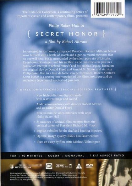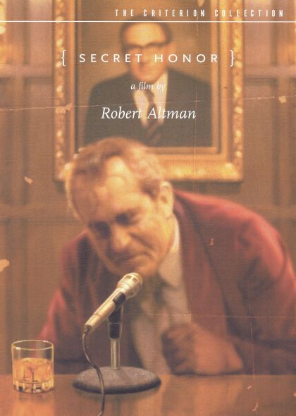 After resigning in disgrace, Richard Nixon (Philip Baker Hall) sits at a desk in his study late at night, dictating his memoirs. Taking one drink, then another, he rants about Eisenhower, Castro, Khruschchev, Kissinger, the Kennedys, and any number of other people, some real, some imagined, finally cohering into a remarkable explanation of why his fall from grace was actually a supreme and selfless act of patriotism. Robert Altman's film adaptation of Hall's one-man show (written by Donald Freed and Arnold Stone) makes this performance feel more cinematic than one might expect, as the visual rhythms subtly match the ebbs and flows of Hall's performance. While Hall doesn't look or sound much like Nixon, the sheer, paranoid force of his characterization is thoroughly convincing: love Nixon or hate him, Secret Honor will give you plenty of support either way.