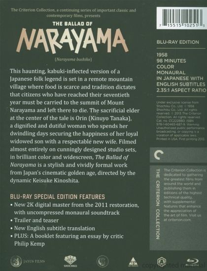 In Kabuki style, the film tells the story of a remote mountain village where the scarcity of food leads to a voluntary but socially-enforced policy in which relatives carry 70-year-old family members up Narayama mountain to die. Granny Orin is approaching 70, content to embrace her fate. Her widowed son Tatsuhei cannot bear losing his mother, even as she arranges his marriage to a widow his age. Her grandson Kesa, who's girlfriend is pregnant, is selfishly happy to see Orin die. Around them, a family of thieves are dealt with severely, and an old man, past 70, whose son has cast him out, scrounges for food. Will Orin's loving and accepting spirit teach and ennoble her family?