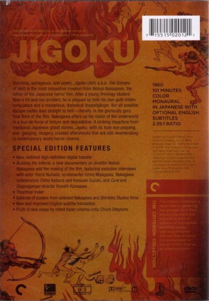 Criterion has assembled an informative package for this chilling cult favorite. Jigoku is given a strong anamorphic, letterboxed transfer that does a good job of capturing the film's stark, shadowy look with an impressive depth of detail the primary colors used in the film's creepy second look positively startling here. The audio portion of the disc sticks to the original Japanese mono soundtrack, which is presented with clear, well-translated English subtitles, and the track sounds pretty good for its age and its mono-based limitations. Criterion has also assembled a tidy little package of extras for the film. First up is "Building the Inferno," a 40-minute featurette that covers the making of Jigoku, the career of Nobuo Nakagawa and how the film influenced many modern Japanese horror film directors. It provides a loving tribute to the film and its creator and those who are new to Japanese horror cinema will be happy to note that this featurette goes into detail about Japan's uniquely personalized approach to the genre. Elsewhere, the disc features the film's original theatrical trailer and a gallery of posters from selected Nakagawa films and Shintoho releases. The package is rounded out by a booklet with an insightful, detailed essay on Jigoku and Nakagawa by critic Chuck Stephens. All in all, this is another strong release for Criterion and a great introduction to vintage Japanese horror.