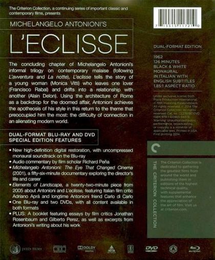 The conclusion of Michelangelo Antonioni's informal trilogy on modern malaise, which began with L'avventura, L'Eclisse (The Eclipse) tells the story of a young woman (Monica Vitti) who leaves one lover (Francisco Rabal) only to drift into a relationship with another (Alain Delon). Using the architecture of Rome as a backdrop for the couple's doomed affair, Antonioni reaches the apotheosis of his modernist style