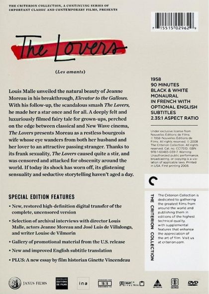 The Lovers Les Amants furthered the reputations of both director Louis Malle and star Jeanne Moreau -- and also pushed the boundaries of American censorship 1959 vintage to the breaking point. Moreau plays a humdrum housewife whose life brightens considerably when she meets a handsome young archeologist Jean-Marc Bory. The two enjoy an exquisite evening in the boudoir, and when comes the dawn, Moreau has gained a whole new outlook on things. She abandons her family in favor of Bory, even though neither has the slightest notion of what the future will hold. The Lovers gained notoriety upon its first release as the Movie With the Nude Scene: though a model of decorum by today's standards the most suggestive moment is a shot of Moreau's hand falling limply on the bedsheets, the scene provided fodder for outraged guardians of public morals for several years. One hapless Cleveland theatre owner was arrested on an obscenity charge, a case that went all the way to the Supreme Court. The Venice Film festival took a more liberal stance on the matter, awarding The Lovers a special jury prize.