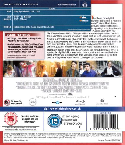 As Shakespearean adaptations go, it's not quite as odd as moving The Tempest to another planet (as in Forbidden Planet ) or Hamlet to a Canadian brewery (the secret subtext of Strange Brew ), but it's still safe to say no one was expecting a version of The Taming of the Shrew set in an American high school. But unlike the previously mentioned films, 10 Things I Hate About You at least gives the Bard screen credit for his contribution to the story. In 10 Things I Hate About You , Bianca Stratford ( Larisa Oleynik ) is a tenth grader who has never gone on a date, as her parents have a little rule where Bianca isn't allowed to go out with boys until her older sister gets a boyfriend. The problem is, while her older sister Kat ( Julia Stiles ) is attractive and intelligent, she's also a mean-spirited misanthrope who rubs nearly everyone the wrong way — especially boys. But Bianca and the guy she has her eye on, Joey Donner ( Andrew Keegan ), are eager to get their romance on the road, so Joey fixes Kat up with Patrick Verona ( Heath Ledger ), a new kid in town who may be just bitter and mysterious enough to suit her. 10 Things I Hate About You is the first feature film for director Gil Junger , who previously worked extensively in television, including episodes of Dharma and Greg , Ellen , and Blossom . — Mark Deming