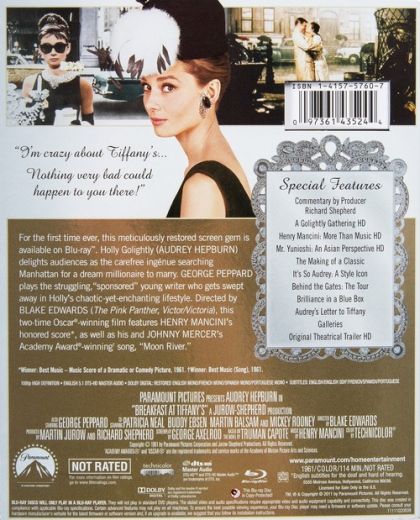 In an idealized New York City during the early '60s, Holly Golightly (Audrey Hepburn) is a charming socialite with a youthful zest for life who lives alone in a nearly bare apartment. She has such a flippant lifestyle that she won't even give her cat a name, because that would be too much of a commitment to a relationship. Maintaining a childlike innocence yet wearing the most perfect of designer clothes and accessories from Givenchy, she spends her time on expensive dates and at high-class parties. She escorts various wealthy men, yet fails to return their affections after they have given her gifts and money. Holly's carefree independence is changed when she meets her neighbor, aspiring writer Paul (George Peppard), who is suffering from writer's block while being kept by a wealthy woman (Patricia Neal). Just when Holly and Paul are developing their sweet romance, Doc (Buddy Ebsen) appears on the scene and complicates matters, revealing the truth about Holly's past. Breakfast at Tiffany's was nominated for several Academy awards, winning Best Score for Henry Mancini and Best Song for Johnny Mercer's classic tune "Moon River". — Andrea LeVasseur
