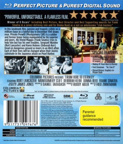 The scene is Schofield Army Barracks in Honolulu, in the languid days before the attack on Pearl Harbor, where James Jones 's acclaimed war novel From Here to Eternity brought the aspirations and frustrations of several people sharply into focus. Sergeant Milt Warden ( Burt Lancaster ) enters into an affair with Karen ( Deborah Kerr ), the wife of his commanding officer. Private Robert E. Lee "Prew" Prewitt ( Montgomery Clift ) is a loner who lives by his own code of ethics and communicates better with his bugle than he does with words. Prew's best friend is wisecracking Maggio ( Frank Sinatra , in an Oscar-winning performance that revived his flagging career), who has been targeted for persecution by sadistic stockade sergeant Fatso Judson ( Ernest Borgnine ). Rounding out the principals is Alma Lorene ( Donna Reed ), a "hostess" at the euphemistically named whorehouse The New Congress Club. All these melodramatic joys and sufferings are swept away by the Japanese attack on the morning of December 7th. No words could do justice to the film's most famous scene: the nocturnal romantic rendezvous on the beach, with Burt Lancaster and Deborah Kerr's bodies intertwining as the waves crash over them. If you're able to take your eyes off the principals for a moment or two, keep an eye out for George Reeves ; his supporting role was shaved down when, during previews, audiences yelled "There's Superman!" and began to laugh. From Here to Eternity won eight Academy Awards, including Best Picture, Best Director, Best Adapted Screenplay, and supporting awards to Sinatra and Reed. — Hal Erickson