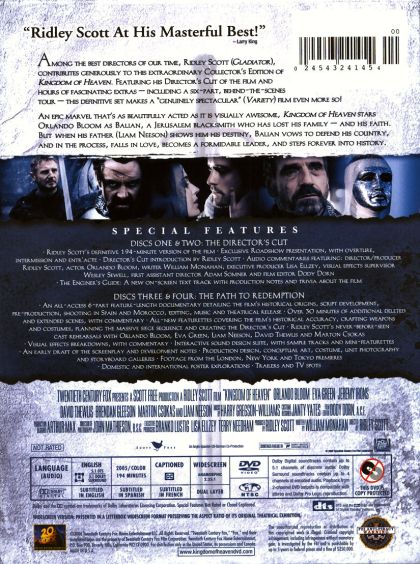 Among the best directors of our time, Ridley Scott (Gladiator), contributes generously to this extraordinary Collector's Edition of Kingdom Of Heaven. Featuring his director's cut of the film and hours of fantastic extras - including a six-part, behind-the-scenes tour - this definitive set makes a "genuinely spectacular" (Variety) film even more so!