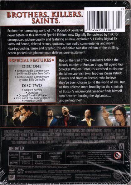 Explore the harrowing world of The Boondock Saints as never before in this Unrated Special Edition, now Digitally Remastered by THX for unsurpassed picture quality and featuring all-new, explosive 5.1 Dolby Digital EX Surround Sound, deleted scenes, outtakes, two audio commentaries and more! Heart-pounding, tense and graphic, this definitive two-disc edition of the thrilling, action-paced cult phenomenon delivers pure excitement!