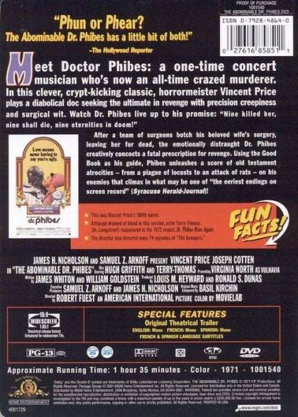 After a team of surgeons botch his beloved wife's surgery, leaving her for dead, the emotionally distraught Dr. Phibes creatively concocts a fatal prescription for revenge. Using the Good Book as his guide, Phibes unleashed a score of old testament atrocities -- from a plague of locusts to an attack of rats -- on his enemies that climax in what may be one of "the eeriest endings on screen record" (Syracuse Herald-Journal)!