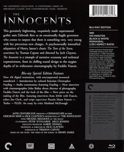 The Innocents, a chilling adaptation of Henry James' novella "The Turn of the Screw," is one of the most frightening films ever made. Set in nineteenth-century England, this gothic ghost story centers around a governess (Deborah Kerr) taking care of two orphans in a foreboding Victorian mansion. As eerie apparitions appear and the children's behavior becomes strange, the governess begins to wonder about the fate of the previous governess and her sadistic lover. Could it be that their restless spirits are conspiring to corrupt the innocence of the children, or is this "haunting" a product of her own fears and imagination?