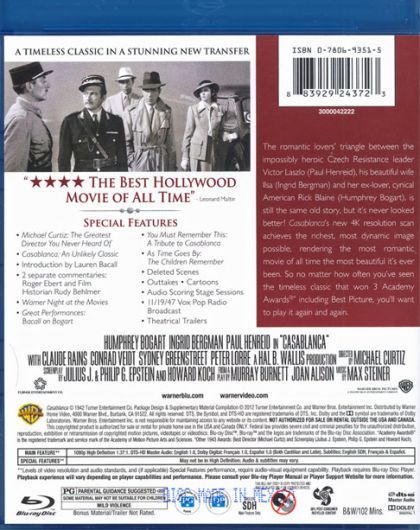 One of the most beloved American films, this captivating wartime adventure of romance and intrigue from director Michael Curtiz defies standard categorization. Simply put, it is the story of Rick Blaine ( Humphrey Bogart ), a world-weary ex-freedom fighter who runs a nightclub in Casablanca during the early part of WWII. Despite pressure from the local authorities, notably the crafty Capt. Renault ( Claude Rains ), Rick's café has become a haven for refugees looking to purchase illicit letters of transit which will allow them to escape to America. One day, to Rick's great surprise, he is approached by the famed rebel Victor Laszlo ( Paul Henreid ) and his wife Ilsa ( Ingrid Bergman ), Rick's true love who deserted him when the Nazis invaded Paris. She still wants Victor to escape to America, but now that she's renewed her love for Rick, she wants to stay behind in Casablanca. "You must do the thinking for both of us", she says to Rick. He does, and his plan brings the story to its satisfyingly logical, if not entirely happy, conclusion. — Robert Firsching