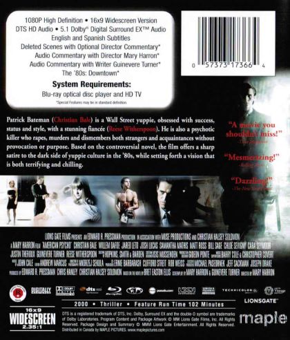 Bret Easton Ellis' dark and violent satire of America in the 1980s is brought to the screen in this unsettling drama with black comic overtones. Patrick Bateman (Christian Bale), the son of a wealthy Wall Street financier, is pursuing his own lucrative career with his father's firm. Bateman is the prototypical yuppie, obsessed with success, fashion, and style. He is also a serial killer who murders, rapes, and mutilates both strangers and acquaintances without provocation or reason. Donald Kimble (Willem Dafoe), a police detective, questions Bateman about the disappearance of Paul Allen (Jared Leto), whom Patrick murdered several days earlier. As Kimble stays on Bateman's trail, Bateman's mask of studied, distant cool begins to fall apart. American Psycho also features Reese Witherspoon as Bateman's girlfriend, as well as Samantha Mathis, Chloe Sevigny, and Guinevere Turner; the latter also co-authored the screenplay. Controversy followed the production from the start, when speculation that Leonardo Di Caprio would play Bateman sparked concerns that he would lure preteens to an R-rated movie. Di Caprio soon bowed out of the project, and original leading man Bale was reinstated. Later, a group of Toronto residents attempted to block filming in that city after Canadian serial killer Paul Bernardo claimed that Ellis' novel inspired his murder spree. — Mark Deming