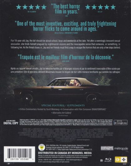 For 19-year-old Jay, fall should be about school, boys and weekends out at the lake. But after a seemingly innocent sexual encounter, she finds herself plagued by strange visions and the inescapable sense that someone, or something, is following her. Faced with this burden, Jay and her teenage friends must find a way to escape the horrors that seem to be only a few steps behind.