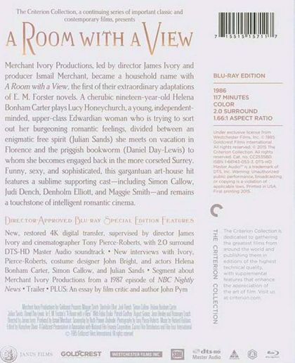 Adapted by Ruth Prawer Jhabvala from the novel by E.M. Forster, A Room with a View is a shining example of Merchant-Ivory's ability to achieve maximum quality and opulence at minimum cost. Set during the Edwardian Era, the film stars Helena Bonham Carter as Lucy Honeychurch, who like all proper young British ladies is compelled to tour Europe in the company of an older chaperone — in this instance, her spinster cousin Charlotte Bartlett (Maggie Smith). While in Italy, the ladies make the acquaintance of a wide variety of personalities; the most fascinating of their fellow tourists — at least in Lucy's eyes — is free-spirited George Emerson (Julian Sands). Aware that her cousin is becoming too familiar with Emerson, Charlotte demands that Lucy return to England posthaste. Lucy complacently settles for the tiresomely traditional courtship of nerdish Cecil Vyse (Daniel Day-Lewis) — and then Mr. Emerson moves into the neighborhood. Lucy now finds herself on the horns of a dilemma: Should she opt for a safe, proper marriage to Cecil, or the bohemian unpredictability of the charismatic Emerson? A winner of three Academy Awards, A Room with a View is not what one could call fast-moving, but fans of the Merchant-Ivory team will enjoy luxuriating in the film's leisurely pace and stimulating cast of characters. — Hal Erickson