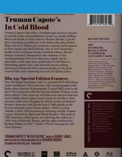 AMG Review: Director Richard Brooks stripped away the outer layers of literary artifice for his screen adaptation of Truman Capote's "non-fiction novel" about a multiple murder in Kansas and instead captured the book's core: a painstakingly researched and breathtakingly detailed account of a crime that had terrible consequences and no real point. Aiming for as realistic and "non-Hollywood" an approach as possible, Brooks shot In Cold Blood in stark but richly detailed black-and-white (Conrad Hall earned an Oscar nomination for his camera work) and filmed much of the action in locations where the events occurred in real life; the result is a film with the narrative strength of a well-structured drama and the unflinchingly honest look of a documentary. Brooks also wisely cast two relative unknowns in the leads; Robert Blake, who made his screen debut in 1938 at the age of 5, gave a striking breakthrough performance as the brutal but weak-willed Perry Smith, and Scott Wilson, in his second screen appearance, was just as convincing as the sly, manipulative Dick Hickock. Both actors practically disappear into their roles, delivering the finest work of their respective careers. The film also shrewdly follows the book's structure in not showing the actual murders until relatively late in the game. Brooks allows us to get to know Smith and Hickock quite well before we see their most brutal and mercenary sides, and we're also given a chance to become acquainted with the doomed members of the Clutter Family; it's ultimately the story of the killers, but the presence of the victims gives the film a greater, more tragic weight. And while Brooks avoids hitting the audience over the head with an anti-capital punishment message, the film's conclusion makes clear that the execution of Perry and Dick serves no more point than the murder of Herbert Clutter and his family: both are mistakes, with no one better off as a result. — Mark Deming