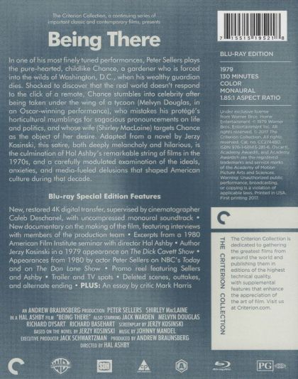 Having lived his life as the gardener on a millionaire's estate, Chance ( Peter Sellers ) knows of the real world only what he has seen on TV. When his benefactor dies, Chance walks aimlessly into the streets of Washington D.C., where he is struck by a car owned by wealthy Eve Rand ( Shirley MacLaine ). Identifying himself, the confused man mutters "Chance...gardener," which Eve takes to be "Chauncey Gardiner." Eve takes him to her home to convalesce, and because Chance is so well-dressed and well-groomed, and because he speaks in such a cultured tone, everyone in her orbit assumes that "Chauncey Gardiner" must be a man of profound intelligence. No matter what he says, it is interpreted as a pearl of wisdom and insight. He rises to the top of Washington society, where his simplistic responses to the most difficult questions (responses usually related to his gardening experience) are highly prized by the town's movers and shakers. In fact, there is serious consideration given to running Chance as a presidential candidate. Both a modern fable and a political satire, Being There was based on the novel by Jerzy Kosinski and costars Melvyn Douglas , who won a Best Supporting Actor Oscar as Eve's aging power-broker husband. — Hal Erickson