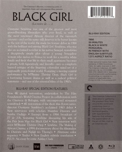 Ousmane Sembène was one of the greatest and most groundbreaking filmmakers who ever lived, as well as the most internationally renowned African director of the twentieth century—but his name deserves to be better known in the rest of the world. He made his feature debut in 1966 with the brilliant and stirring Black Girl. Sembène, who was also an acclaimed novelist in his native Senegal, transforms a deceptively simple plot—about a young Senegalese woman who moves to France to work for a wealthy white couple and finds that life in their small apartment becomes a prison, both figuratively and literally—into a complexly layered critique of the lingering colonialist mind-set of a supposedly postcolonial world. Featuring a moving central performance by M’Bissine Thérèse Diop, Black Girl is a harrowing human drama as well as a radical political statement—and one of the essential films of the 1960s.