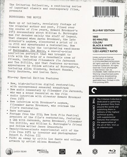 Burroughs: The Movie is the first and only documentary to be made about and with the full participation of writer William S. Burroughs. Howard Brookner began shooting the film in 1978 as his senior thesis at NYU; with Burroughs’ cooperation it subsequently expanded into a feature completed 5 years later in 1983. The film was shot by Tom DiCillo and the sound was recorded by Jim Jarmusch; both NYU classmates. In a collaboration between Burroughs and director Howard Brookner the film explores Burroughs’ life story along with many of his contemporaries including Allen Ginsberg, Brion Gysin, Francis Bacon, Herbert Huncke, Patti Smith, Terry Southern, and Lauren Hutton. Burroughs: The Movie documents Burroughs’ long, controversial and productive life in great detail, film traveling from the American Midwest to North Africa, through defining moments of his wildly unconventional life, including several personal tragedies, charting the development of Burroughs’ unique literary style.