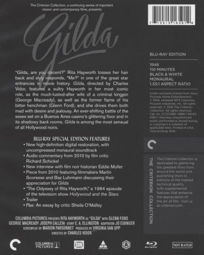 Just arrived in Argentina, small-time crooked gambler Johnny Farrell is saved from a gunman by sinister Ballin Mundson, who later makes Johnny his right-hand man. But their friendship based on mutual lack of scruples is strained when Mundson returns from a trip with a wife: the supremely desirable Gilda, whom Johnny once knew and learned to hate. The relationship of Johnny and Gilda, a battlefield of warring emotions, becomes even more bizarre after Mundson disappears...