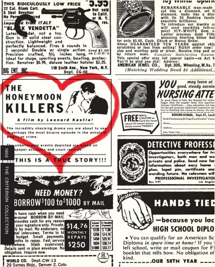 A chilling portrayal of desperation and murder, director Leonard Kastle's The Honeymoon Killers arrives on DVD courtesy of The Criterion Collection. Presented in 1.85:1, the image is generally sharp, with solid blacks and a clear, crisp image. The audio, rendered in English Dolby Digital Mono, rings through as tinny and hollow at times, making it difficult to understand dialogue. This is not likely a problem with the mastering, but the result of the original audio recording process. Menus are cleverly designed in the manner of old newspaper ads, and are easy to navigate. As usual with any Criterion release, the extra features offer an insightful look into the film with a variety of options for the inquisitive viewer. A new interview with writer/director Kastle provides much insight into the origins of the story and the film production, and an illustrated essay by Scott Christianson offers a disturbing look into the actual crime spree that inspired the film. Detailed cast and crew biographies by film historian Bruce Eder are also offered, as is a revealing essay by critic Gary Giddins.